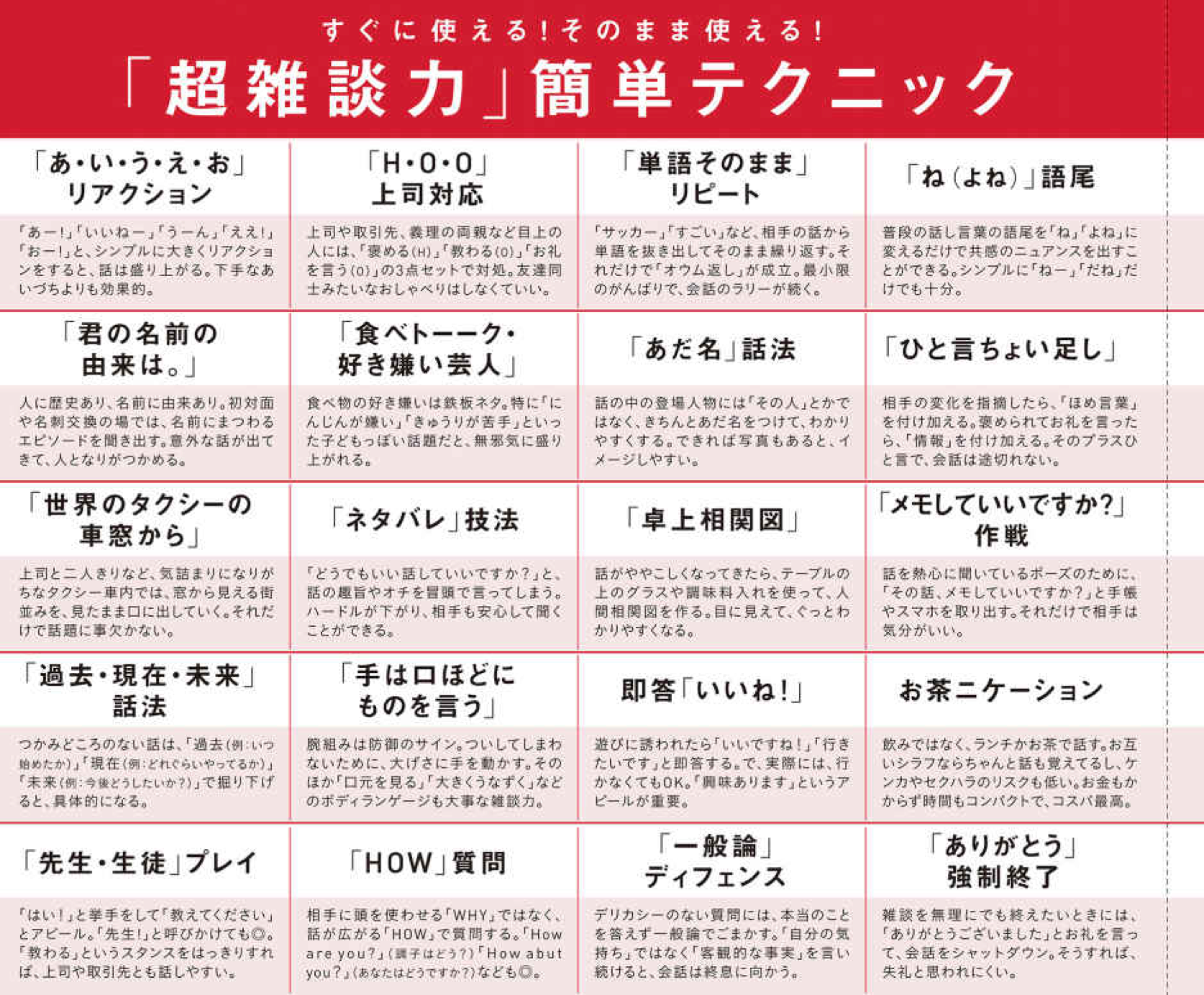 13×「」○「」14×見切り発車で話し始める○「」15×「」「」○「」「」16×「」○「」17×「」○「」18×事実(ファクト)で話す○雰囲気(ニュアンス)で話す19×的確なツッコミを入れる○「」、20×オープンクエスチョンで広がりを持たせる○クローズドクエスチョンでリズムをつける21×褒められたら謙遜する○褒められたらお礼を言う