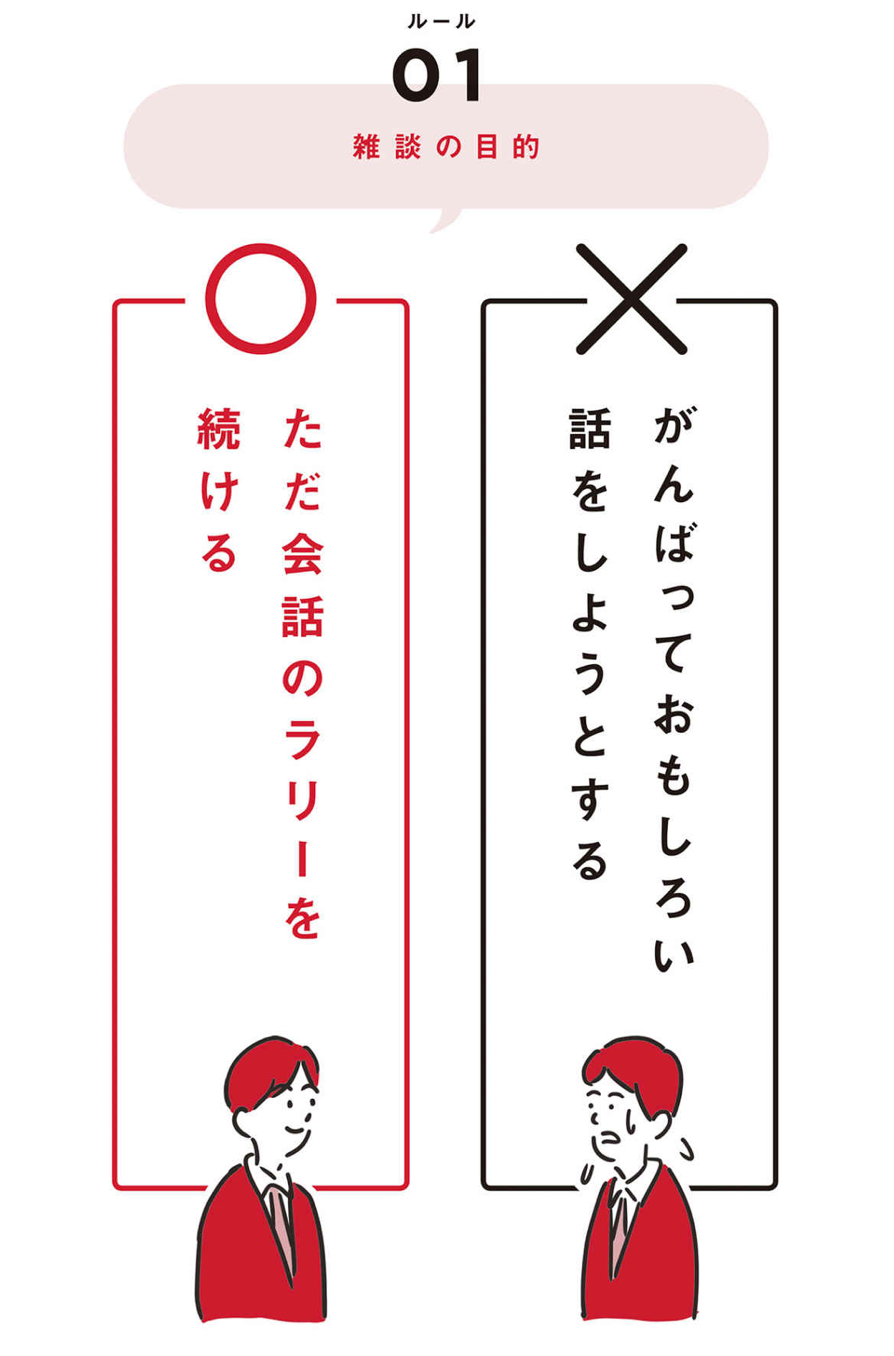 が、まずは、「雑談におもしろい話や結論は要らない。ただただ、続きさえすればそれでいい」という第1のルールを、しっかりと頭にたたき込んでください。