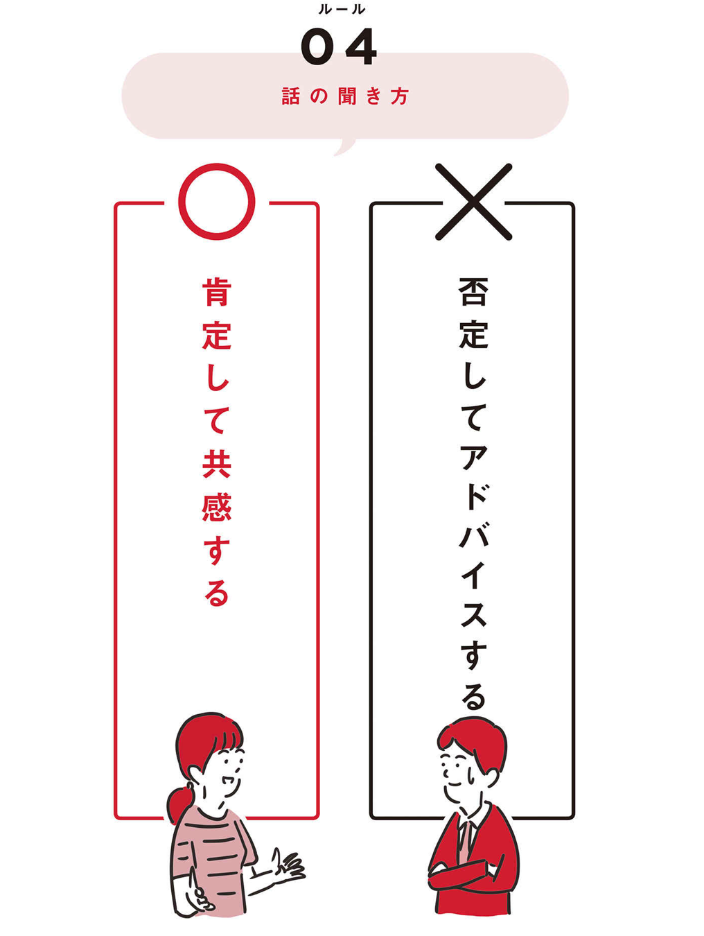 相手の話を聞くときは、とにかく肯定する。とにかく共感する。これが第4のルールとなります。