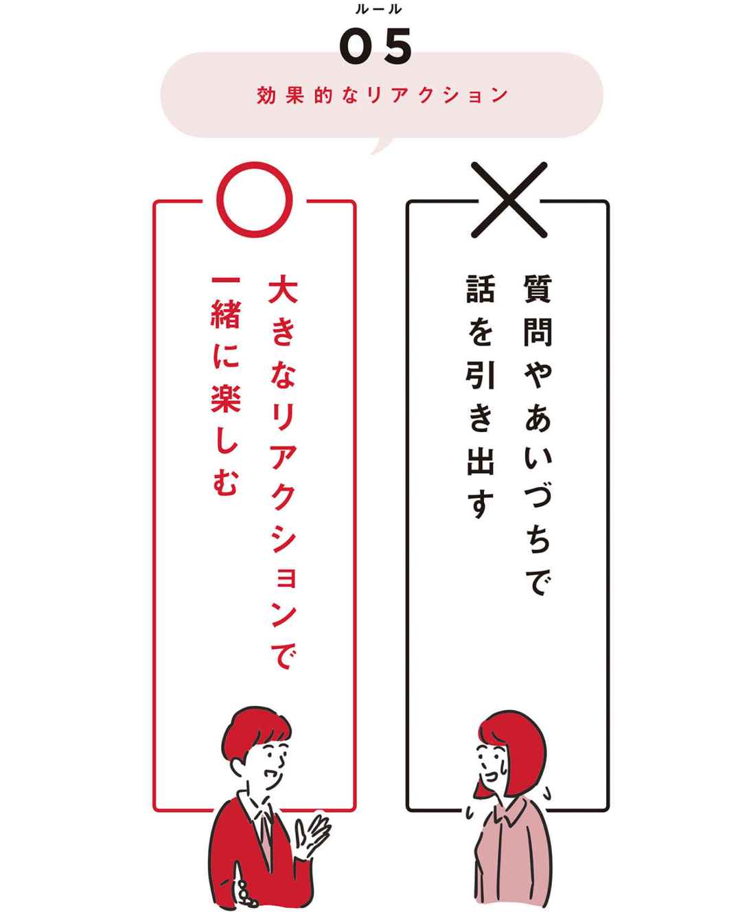 第4のルール「肯定して共感する」に加えてもうひとつ、気をつけるべきなのは、それはリアクションをよくすること、です。