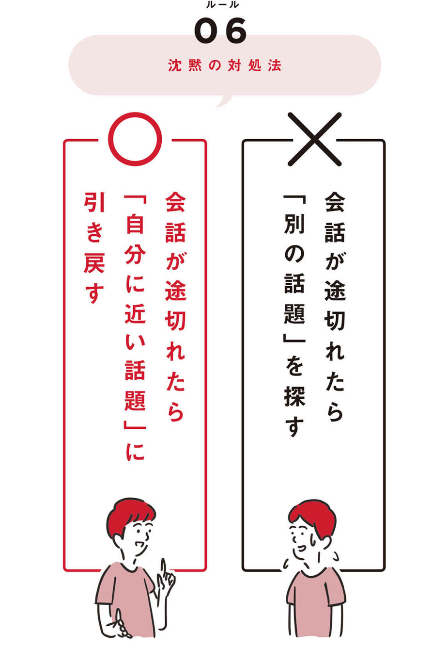 自分が体験したこと、思ったことであれば、話が尽きることはありません。沈黙が訪れたら、身近なエピソードをきっかけに気持ちを話すようにする。これが雑談のピンチを救う、大切な第6のルールとなります。