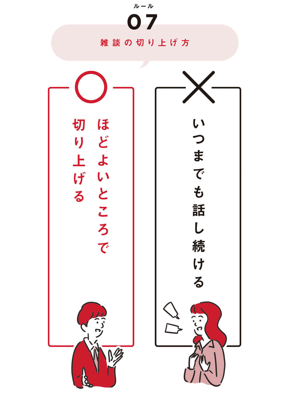 こうすれば、失礼な印象を与えずに、雑談を切り上げることができます。雑談力のルールを逆利用することで、スムーズに、無難に雑談を終わらせる。これこそが、第7の、そして最後の重要なルールとなります。