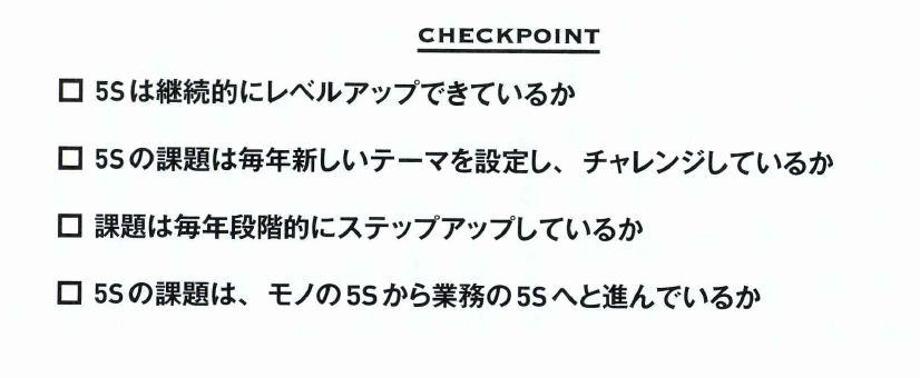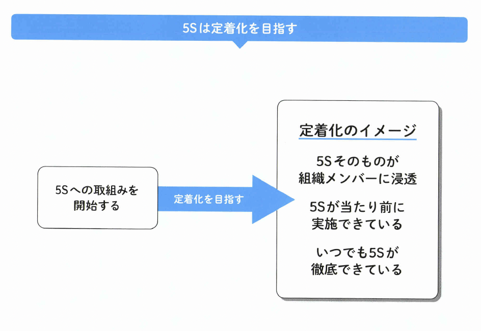 5Sはレベルアツプよりも高いレベルを維持する方が難しいといえます。 定着化することにより、組織全体の体質改善が醸成され、「当たり前のことが当たり前に」できるようになります。