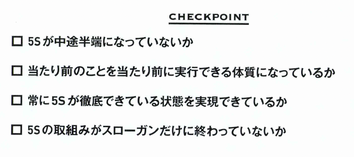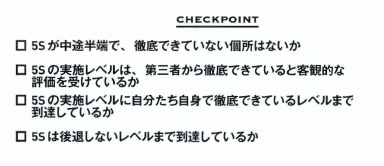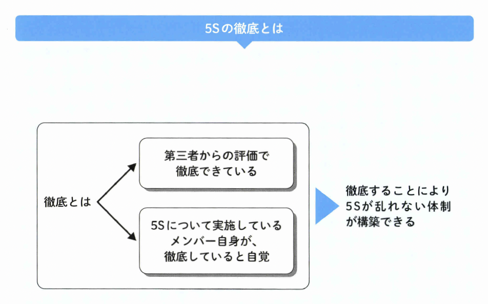 5Sはいつの間にか後退してしまいます。そうさせないためには「徹底」です。 第三者の客観的な評価と、メンバー自身の自覚によって、5Sが乱れない体制をつくることができます。