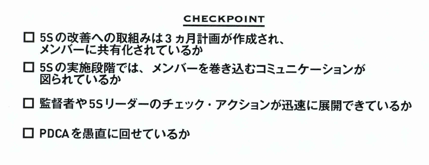 5Sを定着化させるには、5S 推進のPDCAをスピーディに回 さなくてはなりません。さらにそ の局面で、愚直に継続的に回し続 けるしつこさが求められます。 5Sの具体的な展開では、レベ ルアップのための計画を策定。実 行し、その結果については、5S 監査によって実施状況をチエツク します。チェックすることで問題 点を発見し、問題解決の活動につ なげることが5Sを定着化する ために有効です。 PDCA を回す ① 計画は3ヵ月 計画は3ヵ月単位で作成します。 まず、3ヵ月間で実施する個所に ついてリストアップし、それぞれ の対象個所についてのあるべき姿 を具体的に設定します。このイメ ージを、できる限り職場メンバー で共有しながら設定することが重 要です。 さらに、このあるべき姿に到達 すべき計画を作成し、職場メンバ ー間での共有化を図ることが5S レベルの維持や定着化のために必 要であり、重要なポイントです。 ② 実施でのコミュニヶlシ∃ン 計画に続いて、実施段階でも現 場の意見を吸い上げながら進める ことがポイントです。実施段階で メンバーを巻き込むことが5S の定着化につながります。 また、実施段階でできるだけ多 くのメンバーを巻き込むことによ り、5Sの実施率も向上します。 反対にメンバーを巻き込まず、5 S担当者が単独で実施してしま うと、5Sの維持継続は難しくな ります。 ③ 管理監督者のチェック 計画に対する実施状況について 確認が必要です。これがチェック の段階です。 チェックには2つの視点があり ます。1つめは、計画に対する進 捗状況の確認です。計画に対して 予定どおりのべ―スで実施できて いるかどうかの確認です。3ヵ月 の計画に対しては、最低lヵ月に 1度のチェックは必要でしょう。 2つめは5Sの質の確認で、こ れは5S水準のチェックです。管 理監督者の5Sビジョンを実現で きているかという点について現場 を確認しながら、必要に応じて修 正していきます。 ④ 改善に向けてのアクション チェック段階で問題だと感じた 個所があれば、それを明確にして 改善につなげます。このときに重 要なのは、指示命令への対応では なく、自ら考えて行動し、アクシ ョンにつなげているかという点で す。