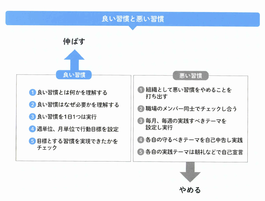 5S の定着化で忘れてはならな いのが、行動の習慣づけです。人 の行動を習慣づけるためには、し つけの実践を徹底します。ただし、 ここでのしつけとは、上司が部下 をしつけるだけでなく、自分を自 分でしつける習慣づけがポイント になります。 しつけにおいては、上司や先輩 が部下や後輩をしつける行動も必 要で、これを否定するものではあ りません。しかし、上司や先輩の しつけだけでは本来5Sが目指 すべき行動を引き出すようなしつ けは実現しません。 本来5Sが目指すべき行動と は、常に自分の行動を自己チェッ クし、問題を発見し、自分で改善 していく行動です。このような行 動を引き出すためには、自分が自 分をしつける行動、すなわち習慣 づけが必要です。 自分が自分をしつけるとは、自 分の行動を自分でチェックし、自 分の良い習慣(行動)と悪い習慣 (行動)を分けて、良い習慣を伸ば し、悪い習慣をやめることを継続 的に実施することです。 良い習慣を伸ばす 良い習慣は、継続して実施する ことにポイントがあります。継続 することにより行為が当たり前に なり、やるべきことをやらないと 落ち着かない、何か違和感がある といった状態になります。これが 本当に体に身についた状態であり、 習慣づいているといえます。 さらに大切な点は、良い習慣を 増やしていくことです。良い習慣 を増やすために必要な項目とは以 下のとおりです。 ・良い習慣とは何かを理解する 。良い習慣がなぜ必要かを理解す る 。良い習慣を1日1つは実行する と意識する 。週単位、または月単位で行動目 標を設定する 。日標とする習慣を実現できたか を自己チェックする など 以上は良い習慣を身につけるた めの一例です。こうした点を意識 し、目標設定し、結果を自己チェ ックすることにより、習慣レベル を向上させることが期待できます。 悪い習慣をやめる 良い習慣を身に付けるより、悪 い習慣をやめる方が難しいのが実 態でしよう。これまで長い期間の 中で身についた習慣を短期間で変 えるのはかなり困難です。そこに はかなりのエネルギーを要します。 しかし、まったく改善できないわ けではなく、やり方や展開方法を 工夫すれば解決できます。ここで は、悪い習慣をなくしたり、良い 習慣へ改善したりする方法につい て、解決のためのアプローチを解 説しておきましょう。 ・組織として悪い習慣をやめることを打ち出す 。職場のメンバー同士でチェック し合う 。毎月、毎週の実践すべきテーマ を設定して実行する 。各自の守るべきテーマを自己申 告し実践する 。各自の実践テーマは朝礼などで 自己宣言する など これらは取組みの一例であり、 参考にするきっかけ程度の項目で す。実際は、各職場の実情を勘案 しながら取り組んでいきましょう。 いずれにしても重要なのは、他 人にしつけられるのでなく、自分 の行動を自分でしつけることです。 自分で自分をしつける行動は納得 につながる行動です。人にしつけ られても、なかなか納得感は感じ られません。5Sではこの納得と いう姿勢をたいへん重要視してい ます。納得しながら5Sに取り 組んでほしいものです。 そして、納得につなげるために は、主体性を持った行動がポイン トになりますc