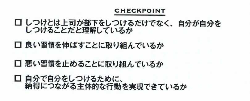 行動を習慣づけるのは自分自身です。行動を常にチェツクして、自分のよい習慣を伸ばし、 悪い習慣を止めるように意識すると、自分自身をしつけることにつながります。