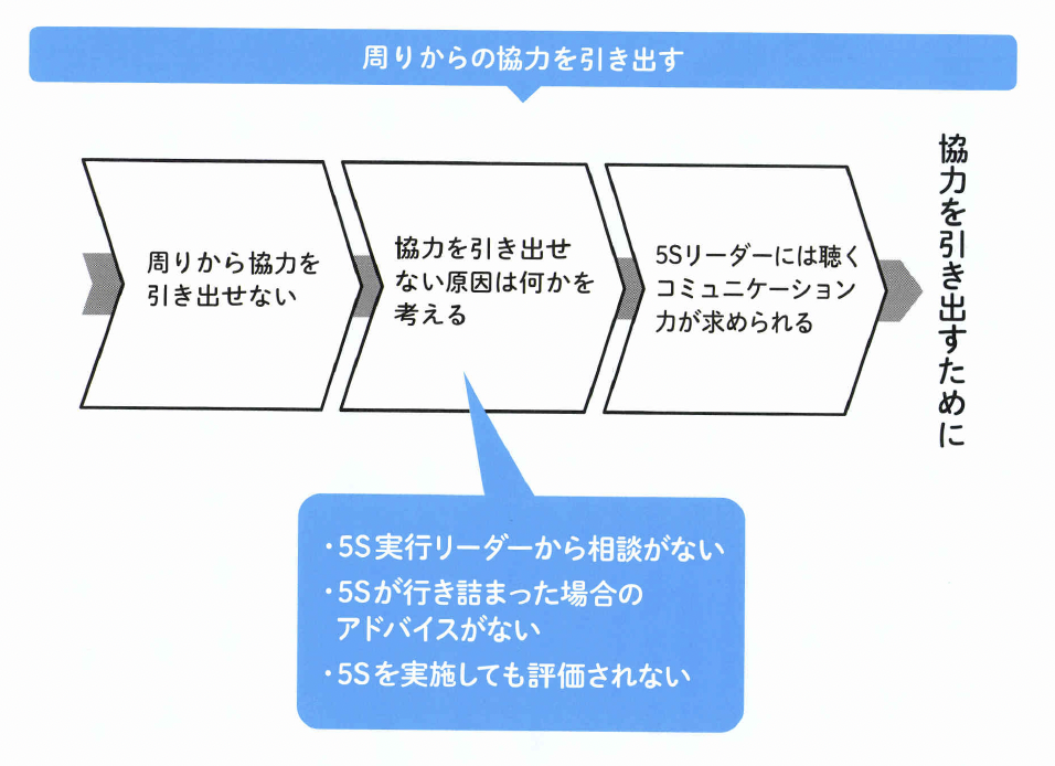 周りの協力が引き出せない 5S への取組みを定着化するに は、組織的に展開することが大切 で、全員参加が基本となります。 全員参加でなければなかなか成果 にはつながらないし、即、後退し てしまうものです。そして実際に 展開する場面では、5S実行リー ダーを決め、実行グループのメン バーを巻き込み、協力を引き出し ながら展開することが必要です。 しかし現実の場面は、5S実行 リーダーから「周りが協力してく れない」「5Sの取組みに参加して くれない」という声を耳にするこ とがあります。そして、ときには 「周りが協力してくれないから5 Sが進まない」という、できない 言い訳のような意見も聞かれます。 このような意見の大部分は言い訳 です。言い訳をしている限り5S は進まないし、当然定着化などは 絶対に実現できません。5S実行 リーダーであれば、このような状 況を打破し、周りの協力を引き出 すことが重要なポイントになりま す。 協力してくれないのは なぜか 「周りが協力してくれない」と考 えるのは誤りです。協力してくれ ないという言い方は受け身であり、 待ちの姿勢になっています。「協 力してくれない」のでなく「協力 させていない、または協力を引き 出せていない」という考えるべき なのです。いかに5Sリーダー が周りに働きかけるかが重要なポ イントになります。 まず考えるべきは、なぜ協力し ないのかを的確に分析することで す。 一般的な要因として、「役割 が曖味である」「協力したいが、何 をどのように協力すればよいかわ からない」「指示が徹底できてい ない」「5Sへの取組み方に不満 がある」などが考えられます。 不満にもさまざまな要因が考え られます。まずは、どのような不 満があるのかを的確に把握しなけ ればなりません。不満の把握は日 ごろのメンバーの行動観察が基本 です。どのような態度をしている かでおおよそ不満の内容は推測で きるものです。代表的なものとし ては次のような点が指摘できます。 ・5S実行リーダーが勝手に進め て自分たちに相談がない 。進め方に行き詰まっても、管理 者や5S実行リーダーから具 体的なアドバイスがない ・5Sを実施しても評価されない 以上は協力を引き出せないケー スの不満の一部です。共通してい る項目として、5S実行り―ダー (管理者の場合もある)とメンバ ーとのコミュニヶlションが不十 分ということが指摘できます。