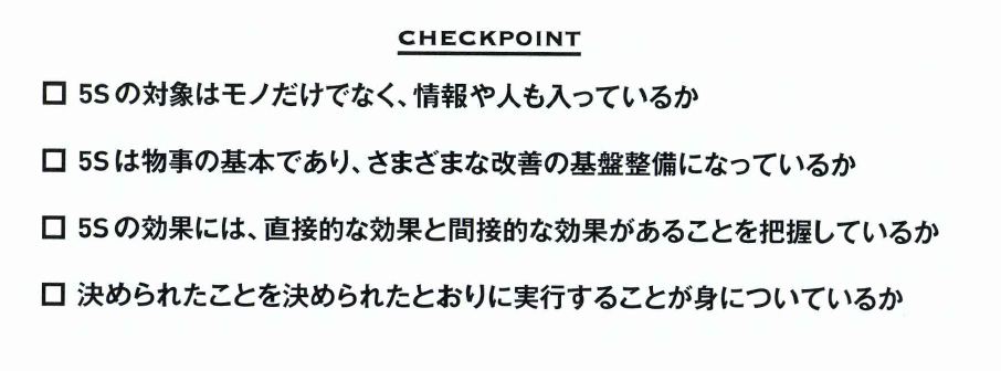 5Sの本質は、モノの環境整備だけではありません。5Sは人材育成のすばらしいツールです。 その点を理解しておかないと、単なるキレイな職場づくりに終始してしまいます。人づくりの観点が重要なのです。
