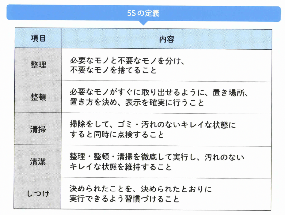 まずは「整理」「整頓」「清掃」「清潔」「しつけ」それぞれの定義と内容を理解することからはじめましよう。 そうすると、5Sが単に職場をキレイにするだけではないことがわかってきます。
