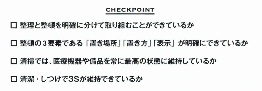 では、どうすれば自主的。主体 的に行動できるのでしょうか。こ の点が5Sを定着化させるために 押さえるべきキーポイントになり ます。 それは「納得」です。すなわち 5Sの必要性や意義について理解 し、なぜ5Sに取り組むのかを納 得していることが大切です。これ は5S への取組みだけではあり ません。何事も納得できるかどう かで、その行動力は大きく異なる ことになります。 では、納得して5Sに取り組む ための要因としては、どのような 点があげられるでしょうか。もち ろん、納得する要素は人により異 なるでしょう。そこでここでは、 共通すると思われる項目について 紹介しておきましょう。 ① 5S の重要性・必要性を 理解する 5Sの重要性・必要性を理解す ることが、納得するための出発点 になります。 一般的に、5Sという用語自体は理解していても、そ の本質的な意味。意義を理解して いる人は少ないようです。 5Sの本質が理解できると、納 得して5Sに取り組めるように なります。 ② 5Sの改善を実際に実施し、 その成果を実感する たとえ5Sの重要性・必要性を 理解していても、取組みに対する 納得までには至らない人も多いで しょう。そこで、5Sの改善を実 際に実践してみて、その成果を実 感することが大切です。実感は納 得につながります。 ③ 5Sは自分のためだけでなく、 他人のために実行する 5Sは自分のためでもあります が、その本質は他人のためにあり ます。医療備品などを使用後確実 に元に戻すのは、次に使う人が使 いやすくするためです。そして最 終的には、患者の皆さんの安全を 確保する、そのための取組みなの です。