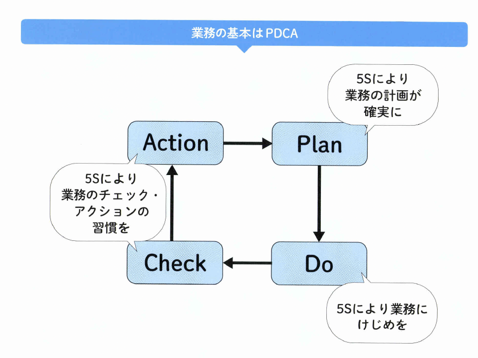 5Sはさまざまな業務を進めるための基本であり、業務の基本はPDCAを確実に回すことです。 PDCAを回すごとに5Sが効果を発揮して、業務を確実に進めることができるようになります。