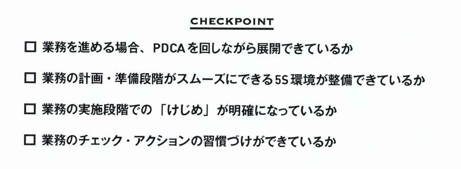 業務の実施段階で大切なポイン 卜は、マニュアルや手順書にした がって、ミスなく確実に進めるこ とです。その重点とは、すでに解 説したように業務を進めるけじめ を明確にして進めることです。手 順。けじめが曖昧だと、ミスを誘 発してしまいます。こうしたミス を排除するために5Sを徹底す るのです。 使用したものを片づける、汚れ たら必ず掃除をする、定期的に整 理するなどの行動を身に付ける取 組みが、けじめを意識して確実に 実行できることにつながります。は、業務が計画どおりに実施でき ているかをチェックし、ズレがあ れば迅速にアクション(改善)し ます。その際、上司から指摘され たチェック・アクションだけでは 不十分です。担当者自らが自分の 業務を自己チェックし、問題があ れば直ちに改善などのアクション につなげることが求められるので す。 しかも、このチェック・アクシ ョンという行動が習慣化され、常 に自主的に実施できることが大切 です。5S では、決められた基準 どおりに実施できているかを、自 己チェックや他者チェックを取り 入れて継続的に活動します。この チェック結果から、問題があれば 即改善する、これを継続的に展開 します。このことで、チェック・ アクションの習慣づけが実現でき るようになり、これが業務の実施 状況をチェックする習慣づけにつ ながります。