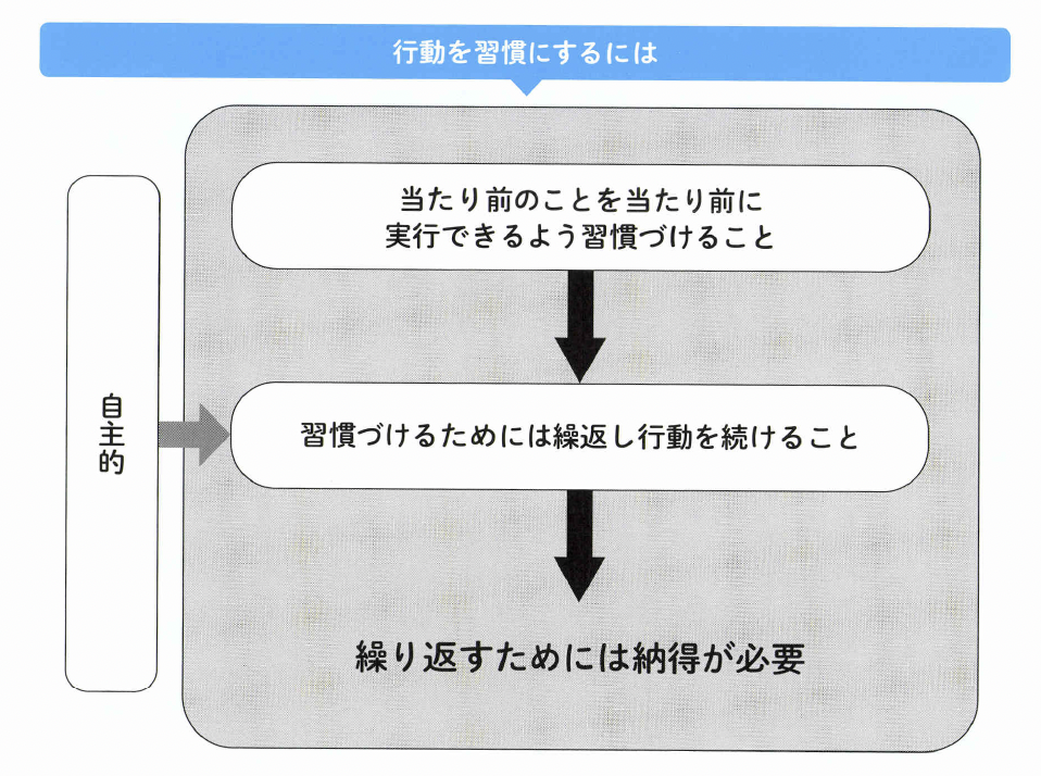 行動が習慣となるためには、ど のようなことが必要でしょか。行 動を習慣にするためには繰返しの 取組みが重要です。人は何度も繰 返して行動していると、それがか なり面倒なことであっても、行動 自体が当たり前になってきます。 そして、行動しないことに対して 不自然さを感じるようになります。 ここまで到達すると、習慣づいた といえるでしょう。 大切なのは繰返しの行動です。 そして、さらに重要なのが繰返し の行動のやり方です。上司の注意 によって繰り返す、先輩に言われ たから繰り返すといった受け身の 行動では習慣になりません。行動 が習慣となり身につくためには、 受け身ではなく、自主的に行動し なければなりません。すなわち、 「他人から言われたから行動する」 のではなく、「自分が必要性を感 じるから行動する」「実施する意 義を感じるから行動する」のです。 この点がとても重要です。このよ うに主体性を持った行動を展開す ることにより、行動が習慣づくこ とになります。