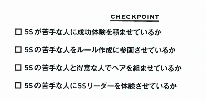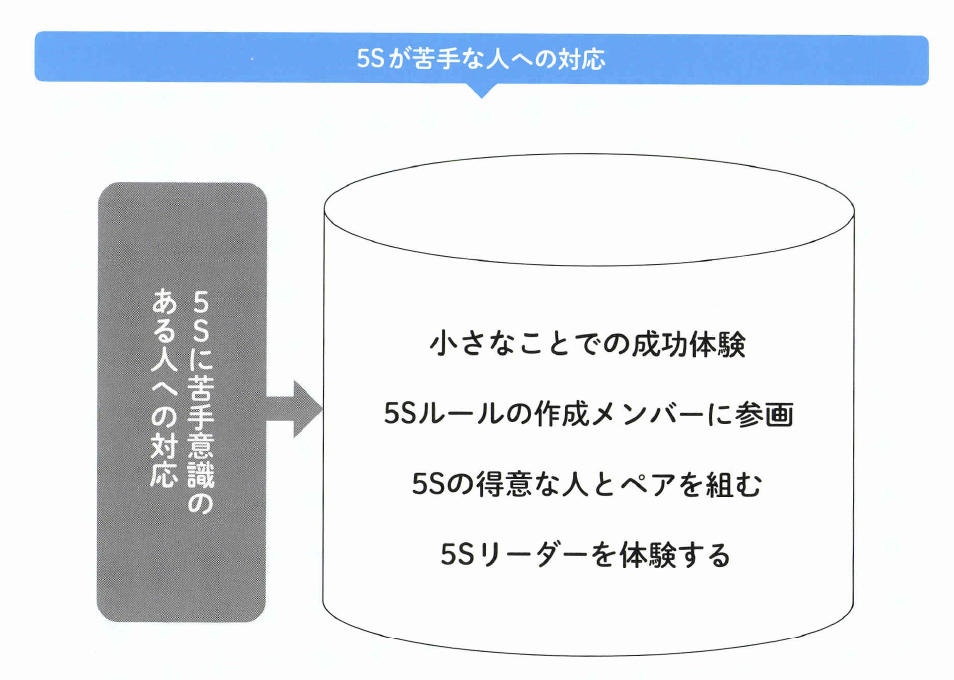 組織的に5Sに取り組むためのポイントは、苦手な人をどうやって巻き込むかです。 苦手意識を解消して「自分もできる」と思つてもらえるように働きかけるのが肝要です。
