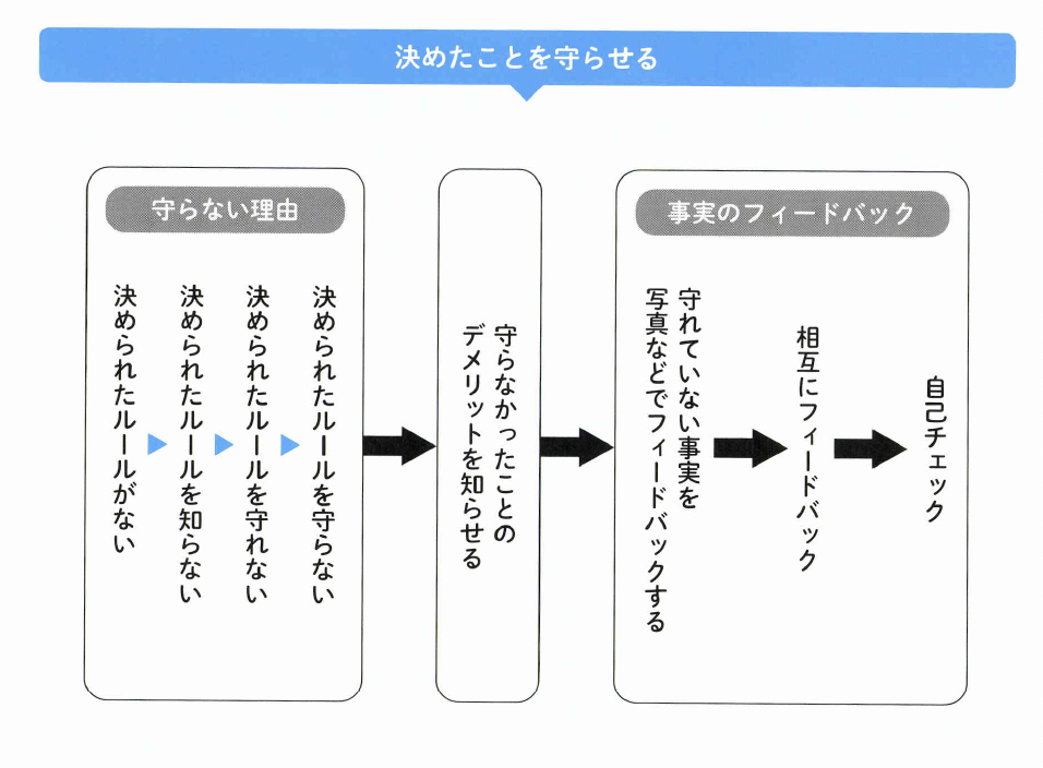決められたルールも、守らなければ意味がありません。守らなかった人には、それによるデメリットを知らせ、 守られなかったという事実をフイードバツクすることで、決めたことを守る体制ができてきます。