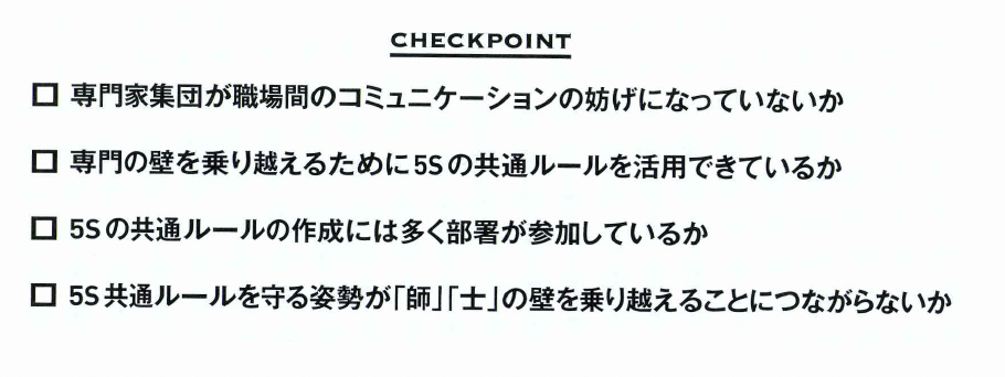 こうした専門家の壁を乗り越え る1つの手段として、5Sに関す る共通ルールの構築というアプロ ―チがあります。これは5Sを成 功させる重要なポイントです。 組織の共通ルールは、医療機関 に限らずどの組織においても必須 です。組織全体の共通ルールが基 本となって、複数の職場間にまた がる問題の解決に効果を発揮しま す。また、このルールが職員のし つけなどにつながってきます。 5Sでは、職員全員が当たり前 のことを当たり前に実施できるこ とが求められます。そこで「当た り前とは何か」を共通ルールとし て明確にすることが大切です。 共通ルールが設定されると、職 員への指導が可能になります。仮 に、決められた共通ルールがなか つたとしたら、職員の指導の徹底 には難しい場面がかなり出てきま す。