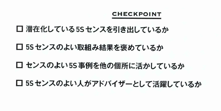 5Sセンスの高い人に対して、 そのセンスや能力を周囲が認める ことが重要です。 一般に、5Sの センスや能力は、通常の業務能力 とは違って、あまり評価されない 傾向にあります。5Sをがんばっ ても評価されず、結果としてやる 気につながらなくなってしまうの です。 そこで、よいところ、がんばっ たところを見つけて、積極的に評 価するよう心掛けます。評価され ることで、5Sへのやる気が引き 出され、5Sセンスを顕在化させ ることができるのです。