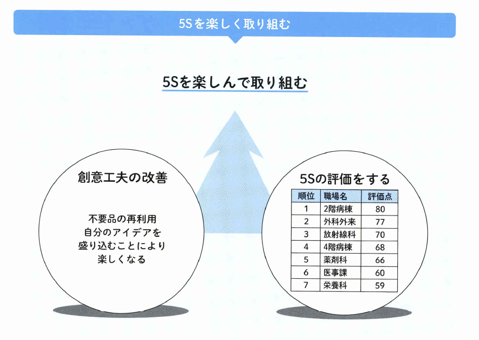 5Sは、楽しみながら取り組む ことが成功の基本条件です。しか し実際には、楽しむどころか「い やいや5S」の姿勢で取り組んで いる医療機関を見かけます。いや いや5Sのスタンスでは、成功は おぼつきません。いやいや5Sは 「上司がうるさく言うからやる」 「5Sラウンドがあるから仕方な くやる」といった受け身の姿勢に なってしまいます。結果的に、長 続きもしないし、成果にはつなが りません。5Sは前向きに、自ら 積極的に取り組むことが求められ るのです。 自ら積極的に取り組むためには 「5Sの取組みが楽しい」ことが重 要な要素となるでしょう。 では、どのようにして取り組む と、楽しさを引き出すことができ るのでしょうか。ここでは、5S を楽しんで取り組むための方策を 解説します。