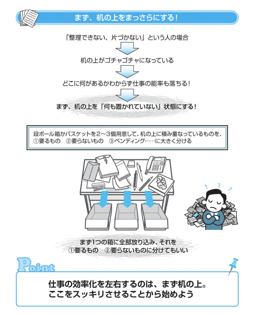 とにかく手を止めず、デスクの上からモノをなくすことが先決です。