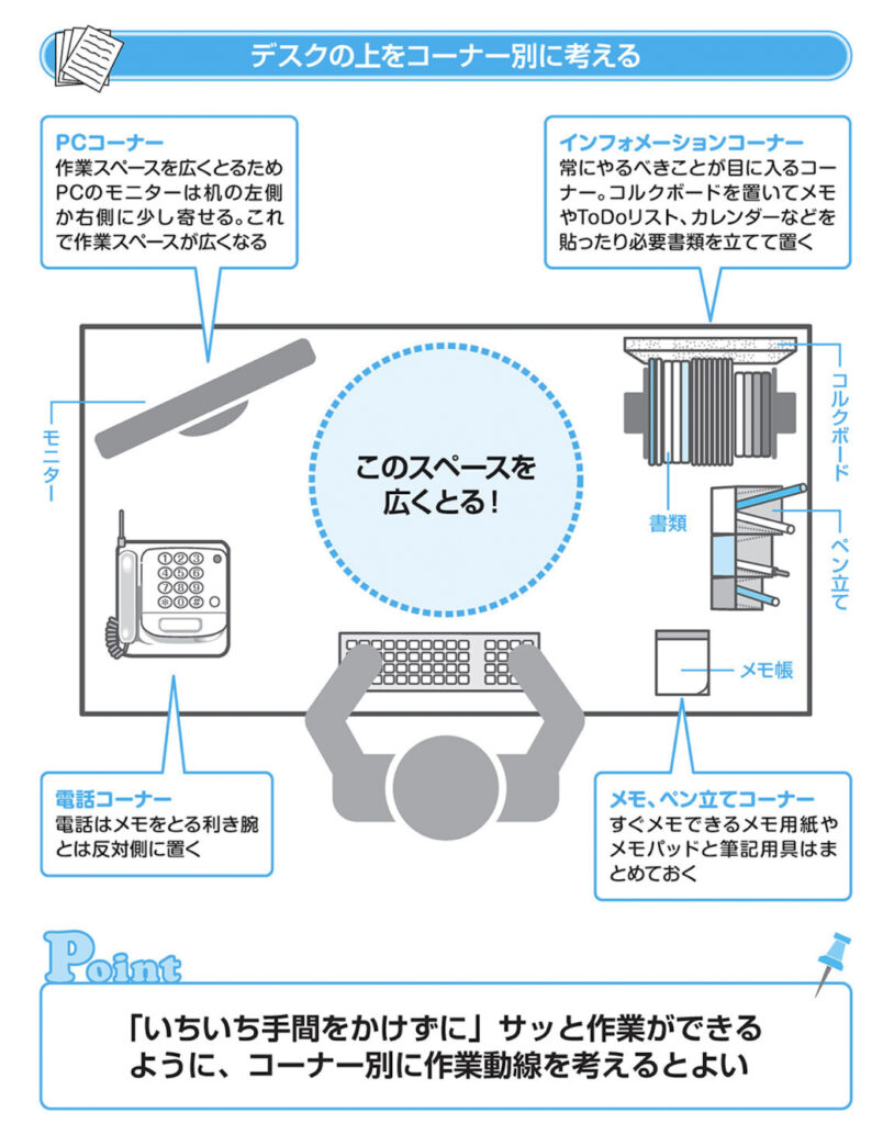デスクの上を「コーナー」別に考える 以上が、動線と使用頻度を意識した基本的なレイアウトです。