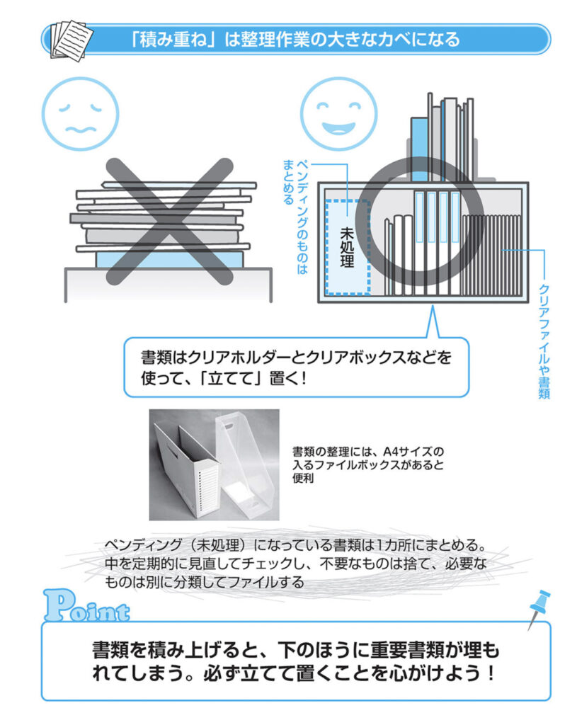 とはいえ、多くの人がついついやってしまうのですが、書類を積み上げると、下のほうに重要書類が〝死蔵〟されたり、必要な書類が見つからなかったりと、良いことはほとんどありません。