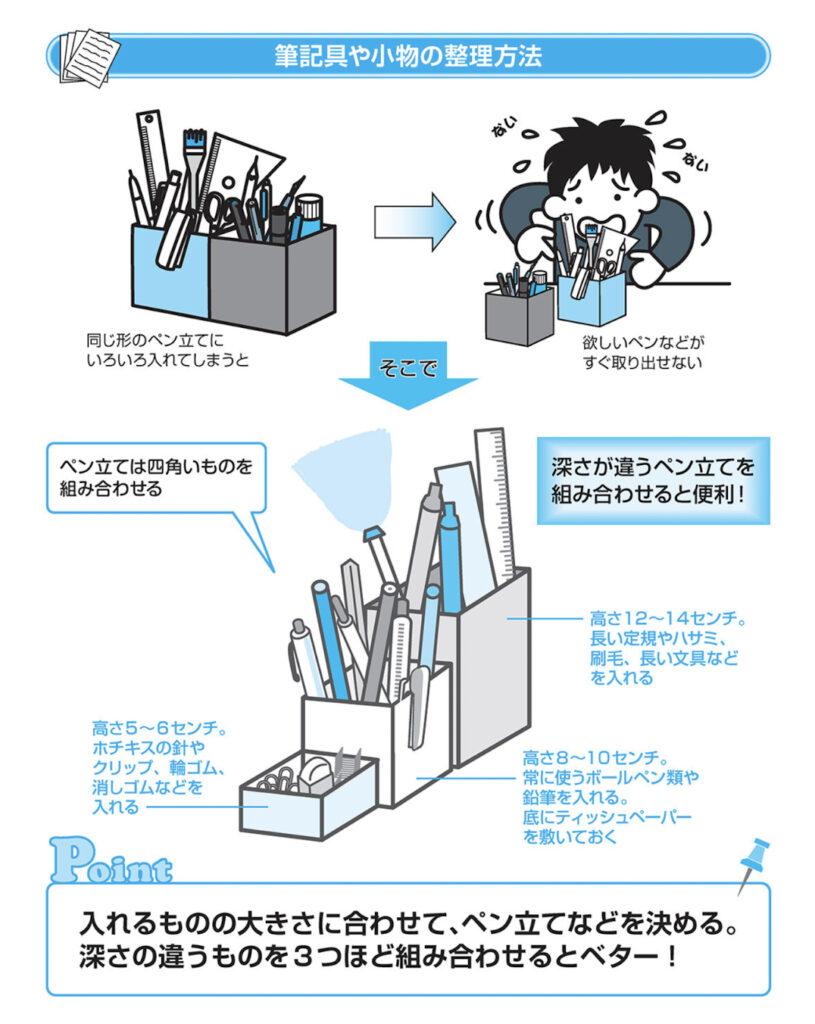 5 ひとつの箱に詰め込まないことが収納のコツ文具・小物がデスクで行方不明にならない方法 ペン立てにひと工夫して整理の効率アップ! 文房具やちょっとした小物類……これらをすべて引き出しにしまっておくと、 1日に何度も引き出しを開閉しなければならず、とても効率が悪くなります。