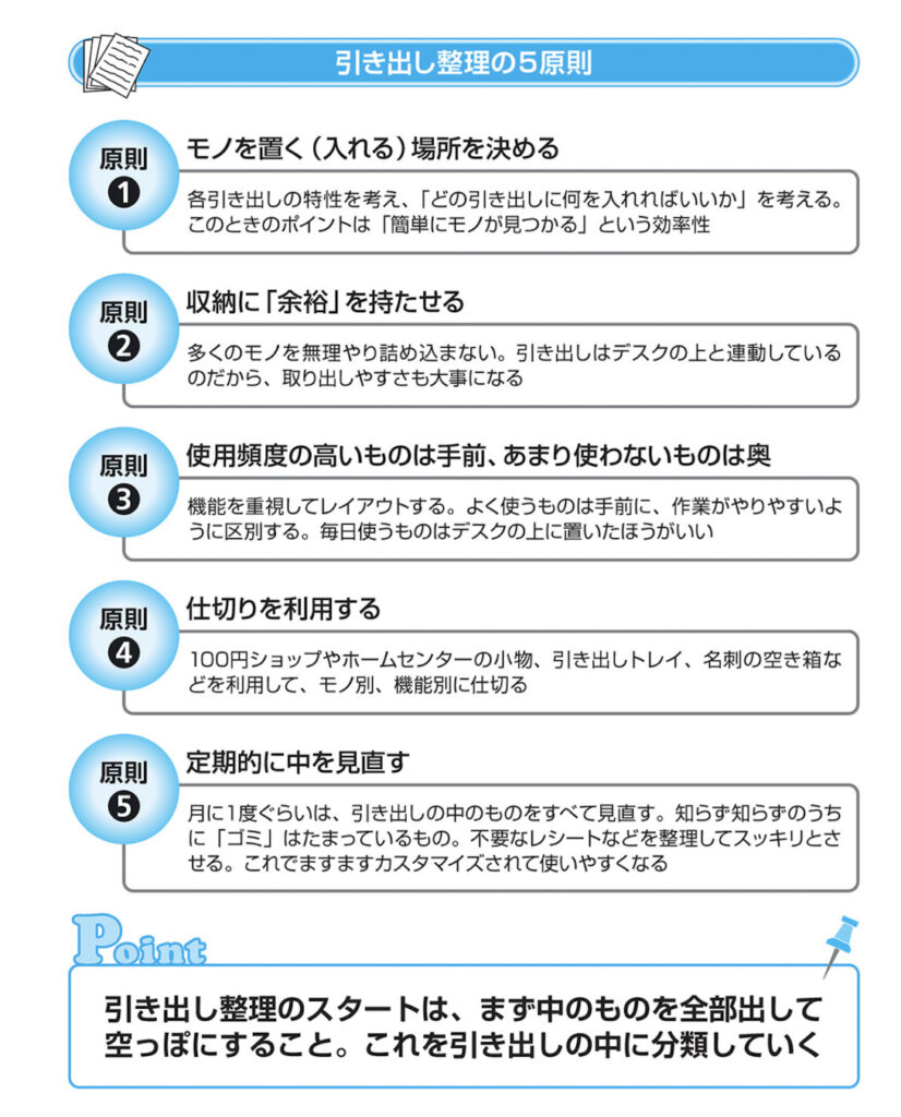 ①必要なものがすぐに取り出せるようにする(使用頻度を意識) ②作業の動線を意識する ③使い終えたものが、すぐにしまえるようなしくみをつくる この 3点が満たされれば、あなたは「椅子に座ったまま」「いちいち手間をかけずに」作業ができるという、最も効率的なデスクを手に入れることができます。
