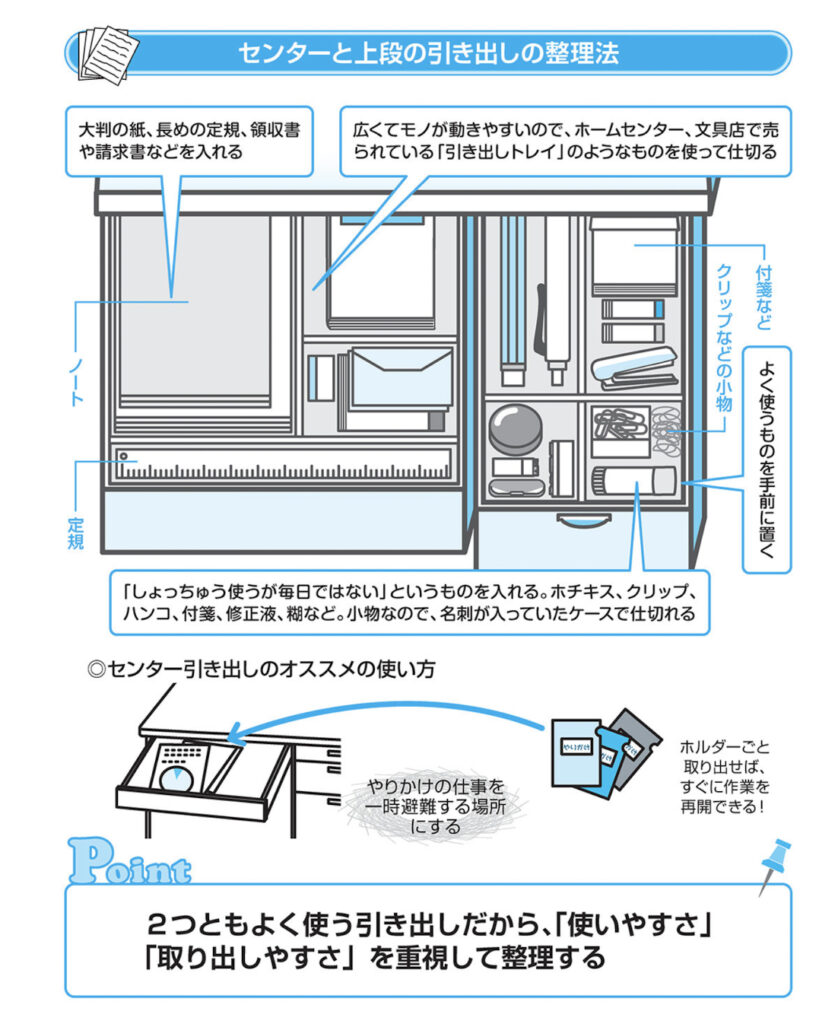 7 上段の引き出しは、いちばん開け閉めがしやすいセンター引き出しの効果的な使い方 センター引き出しには頻繁に使うモノを入れない 標準的なデスクには、「センター」「上段」「中段」「下段」と、4つの引き出しがついています。