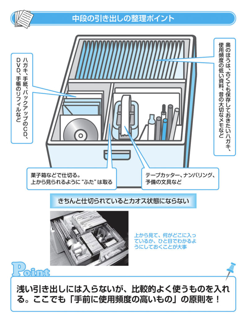 各種道具類や記録媒体の予備といった備品のストックを手前に置き、奥のほうは、たまにしか使わない小物や、保存しておきたい手紙、資料、メモなどを入れるスペースにしましょう。
