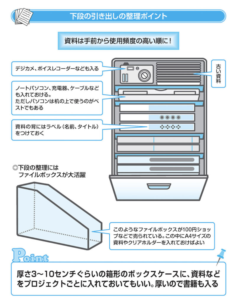 9 下段は A 4ファイルを入れるのが最も効果的下段の引き出しは、上から見てファイルを一覧できるように 整理のためにはファイルボックスを活用する まとめた書類をどこに置くか、で悩む人は多いはずです。