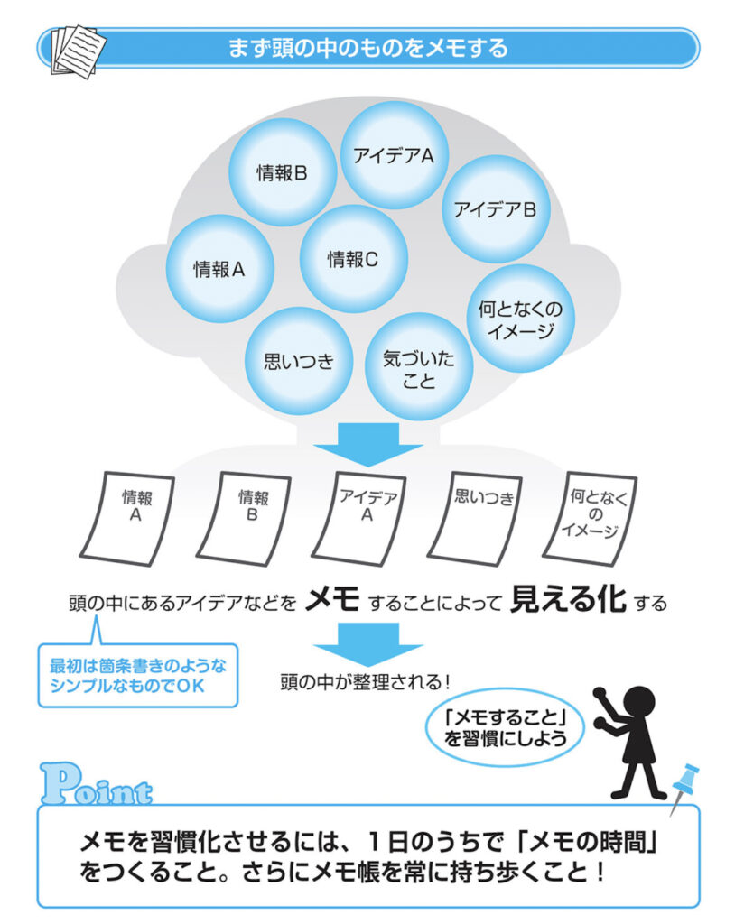 頭の中の整理作業とはすなわち、メモによって自分の頭の中にあるものを「見える化」する作業に他なりません。