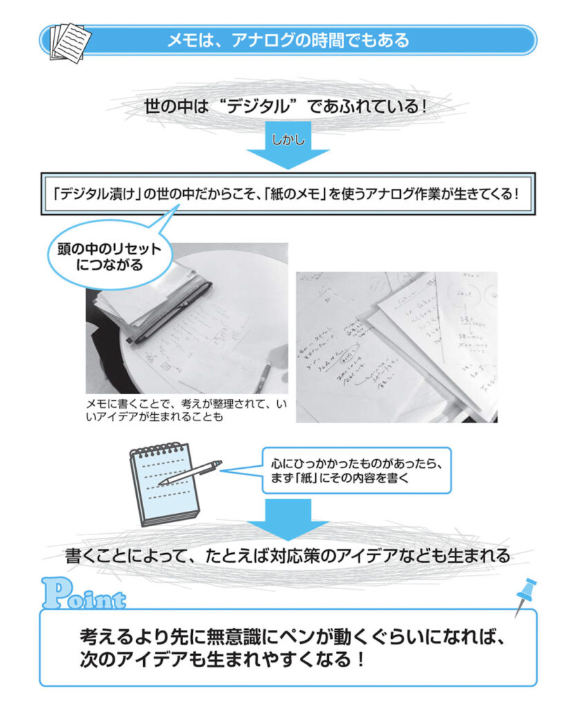 アナログ的作業といえば、一人で散歩をしたり、鉛筆で絵を描くといった「デジタルな日常から逃れる時間」を持つこともおすすめなのですが、頭の中の整理に関して言えば「『紙のメモ』を使う」ことが、具体的な手法として一番有効なものです。