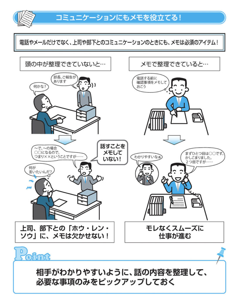 論理的で確実な「ホウ・レン・ソウ」を! また、上司や部下との会話、職場におけるコミュニケーションでもメモは重要です。