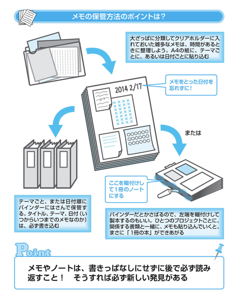 手近な紙にサッと書いたようなメモでも、決まった場所に保管して、後できちんと整理するのです。