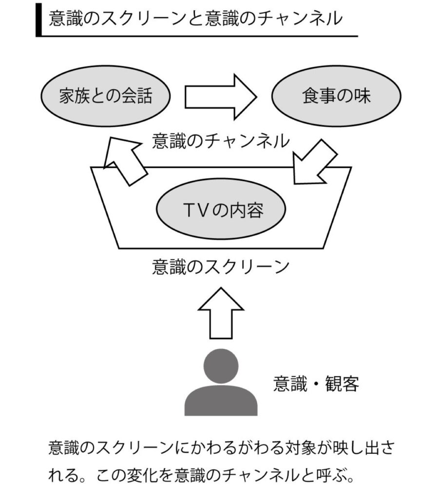 このスクリーンを意識のスクリーンと呼び、スクリーンに映す対象の変化を意識のチャンネルと呼びます。