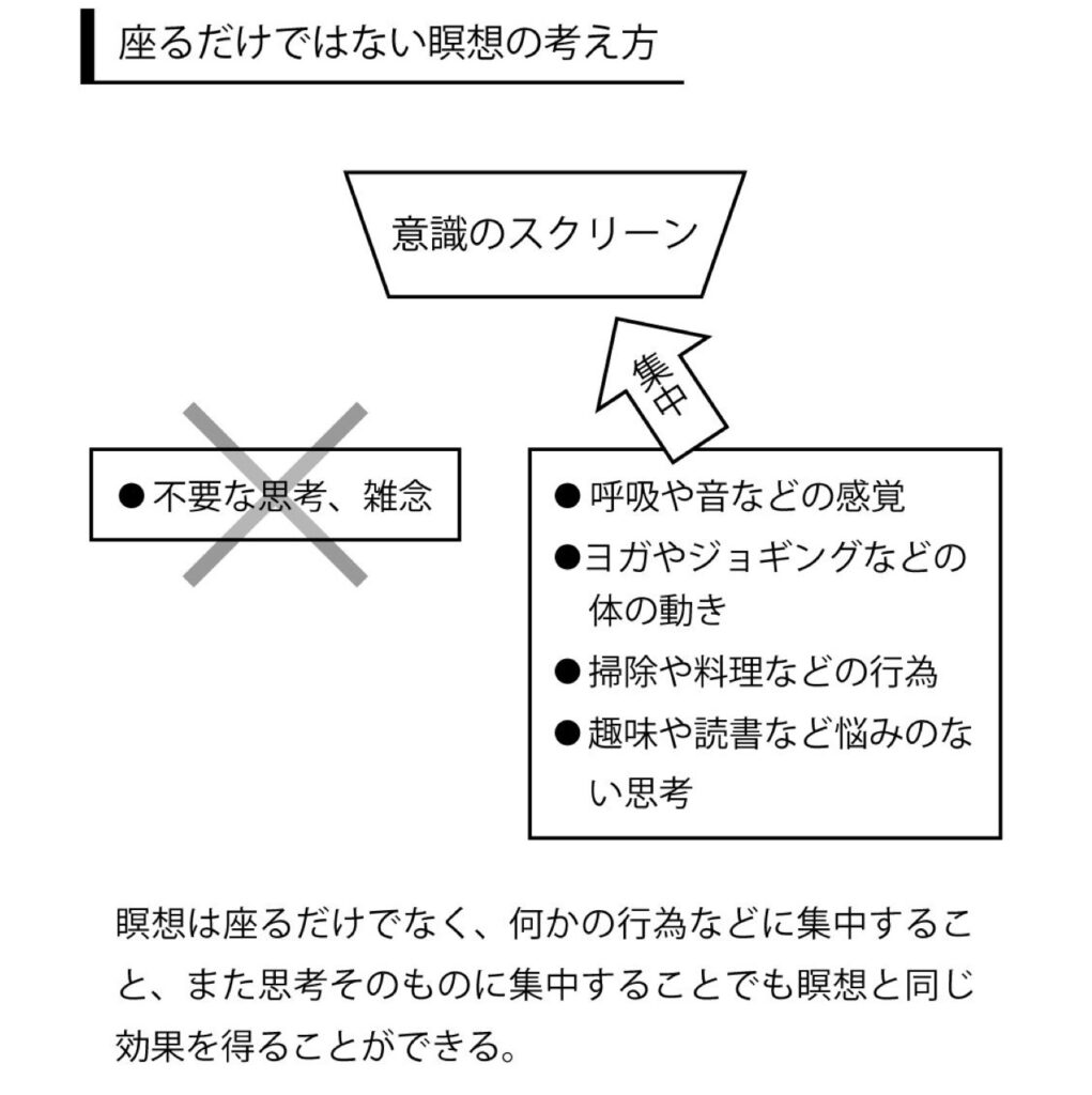 ですから、単に思考を止めることだけが瞑想なのではなく、問題のない思考(読書など)や問題のない思考を含む行為(料理やスポーツなど)に対して集中することでも瞑想と同じ効果があると考えることができます。