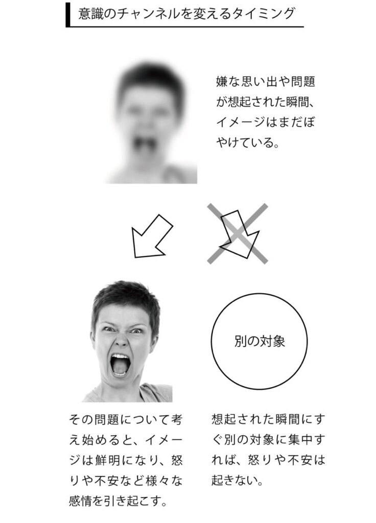 しかし、一番始めの、まだ想起された瞬間のぼやけたイメージの間は、何も感情が起きていないことが分かります。ですから、最初のぼやけたイメージの間に、すぐ意識のチャンネルを変えてしまわなくてはいけません。