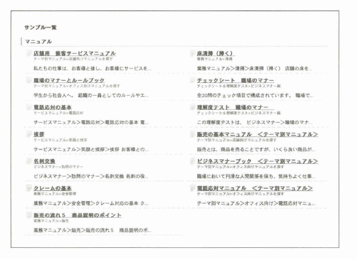 また、「ビジネスマナーブック」「防災・防犯マニュアル」など、 テーマごとに1冊の『マニュアル』として完成されたものも用意して いる。