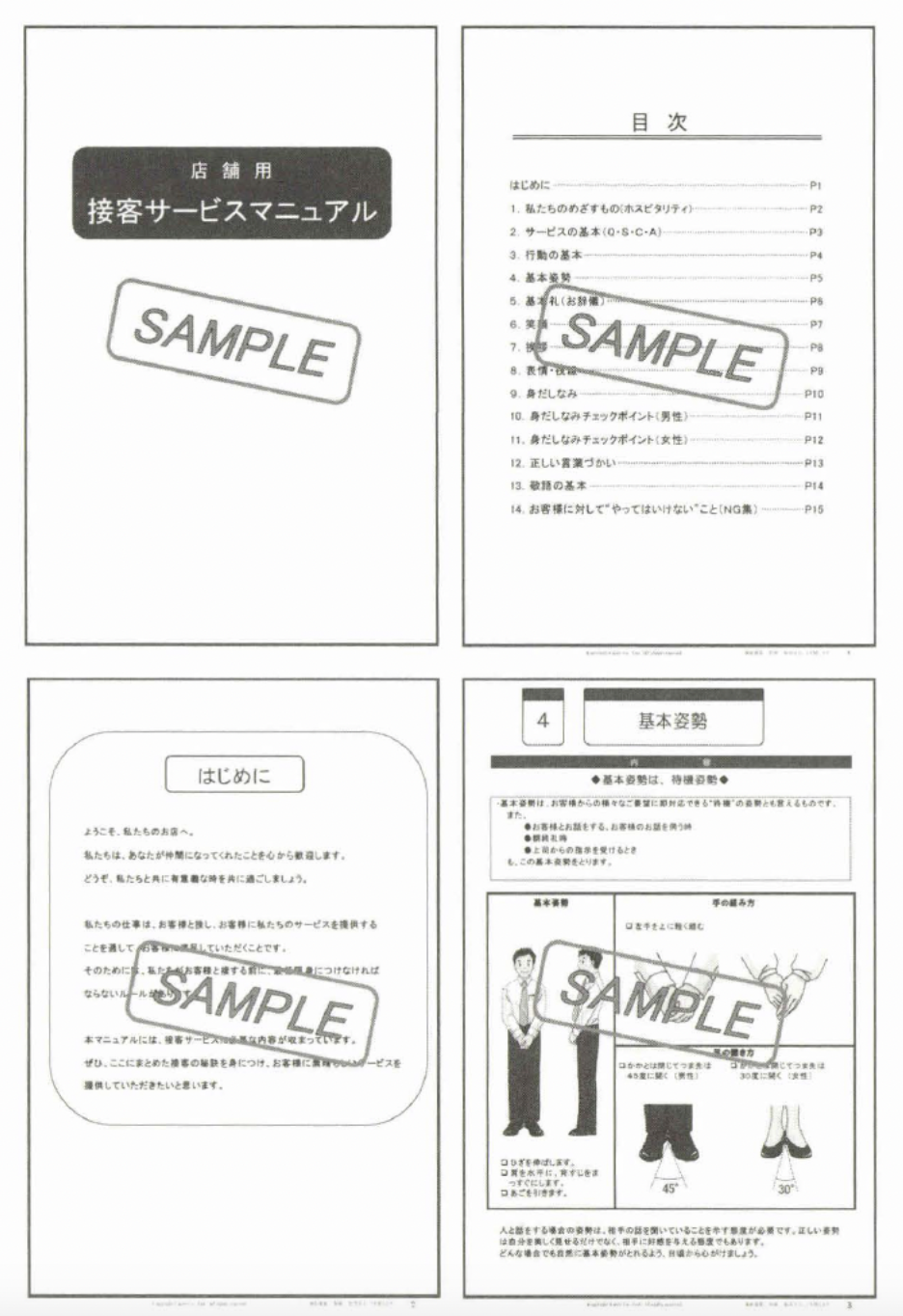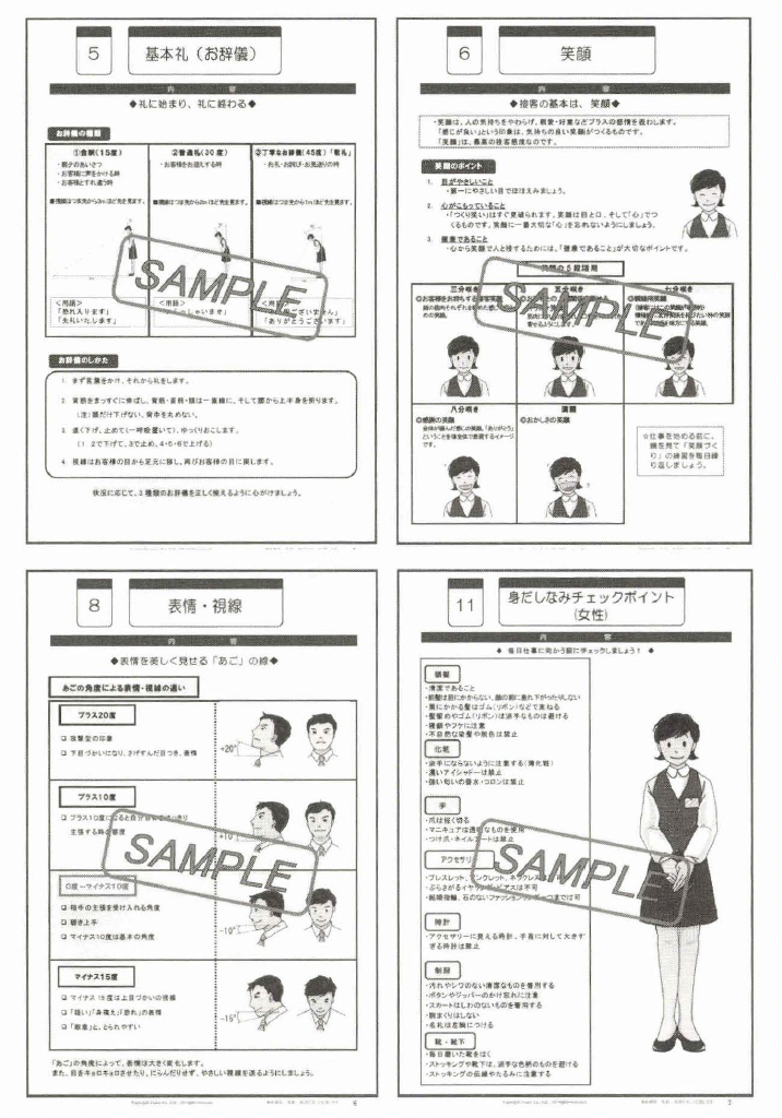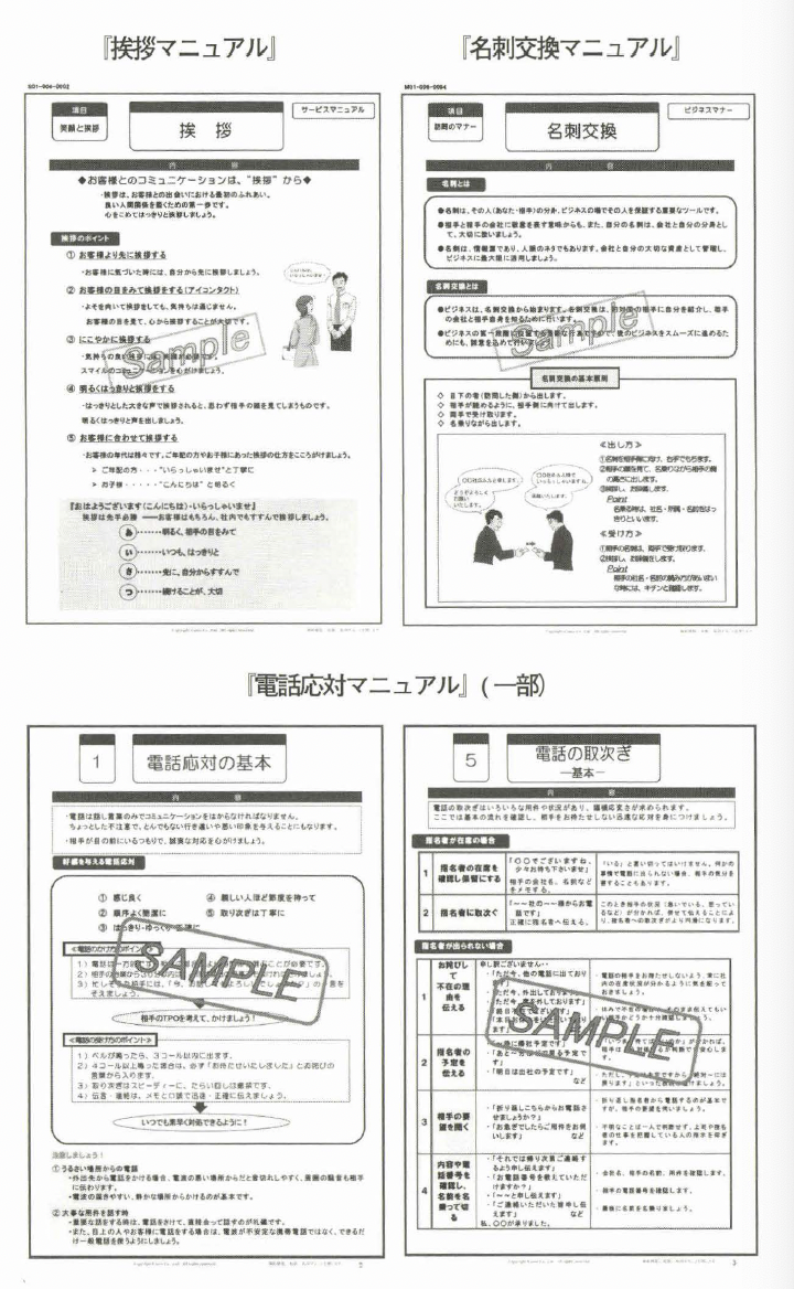 例 えば、「身だしなみ」などは、自社の制服写真などに差し替えること によって、自社版「身だしなみチェックポイント」として使用できる というわけである。