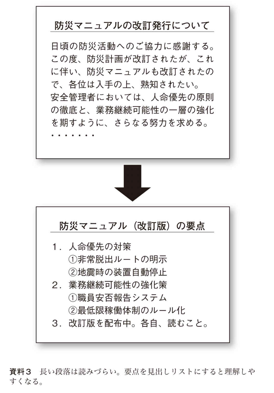 たとえば、資料3のように、挨拶や、経緯、訓示めいたことを普通の文で書いてしまう。これでは読破するのに時間がかかる上に、要点をすくいとることが難しい。