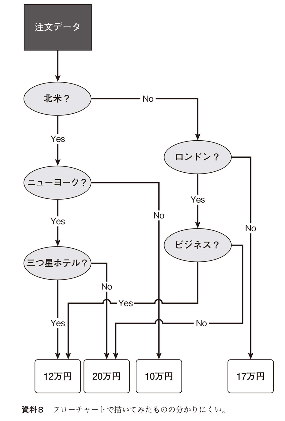 フローチャートの致命的な欠陥は、くねくねと長い矢印を引っ張ることをいとわなければ、次の手順をどこにでも指定できてしまうことである。
