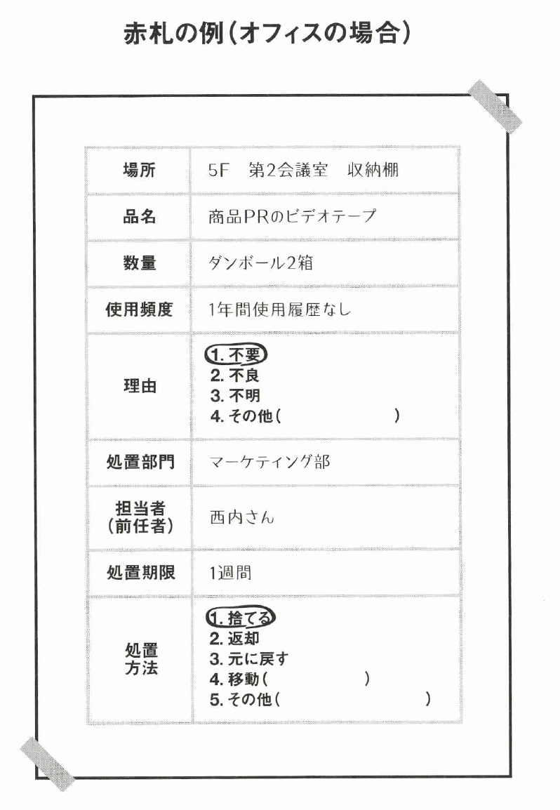そこで、「赤札作戦」をやって、「使わないもの」「使えないもの」をみんなの目の届くところにドーンと置き、言葉は悪いですが、ク見せしめクのような状態をつくります。