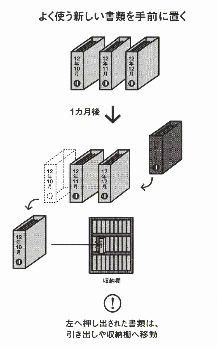 参照することが多い直近の書類については常に手前に置き、古いものはそれとともに押し出されていきます。