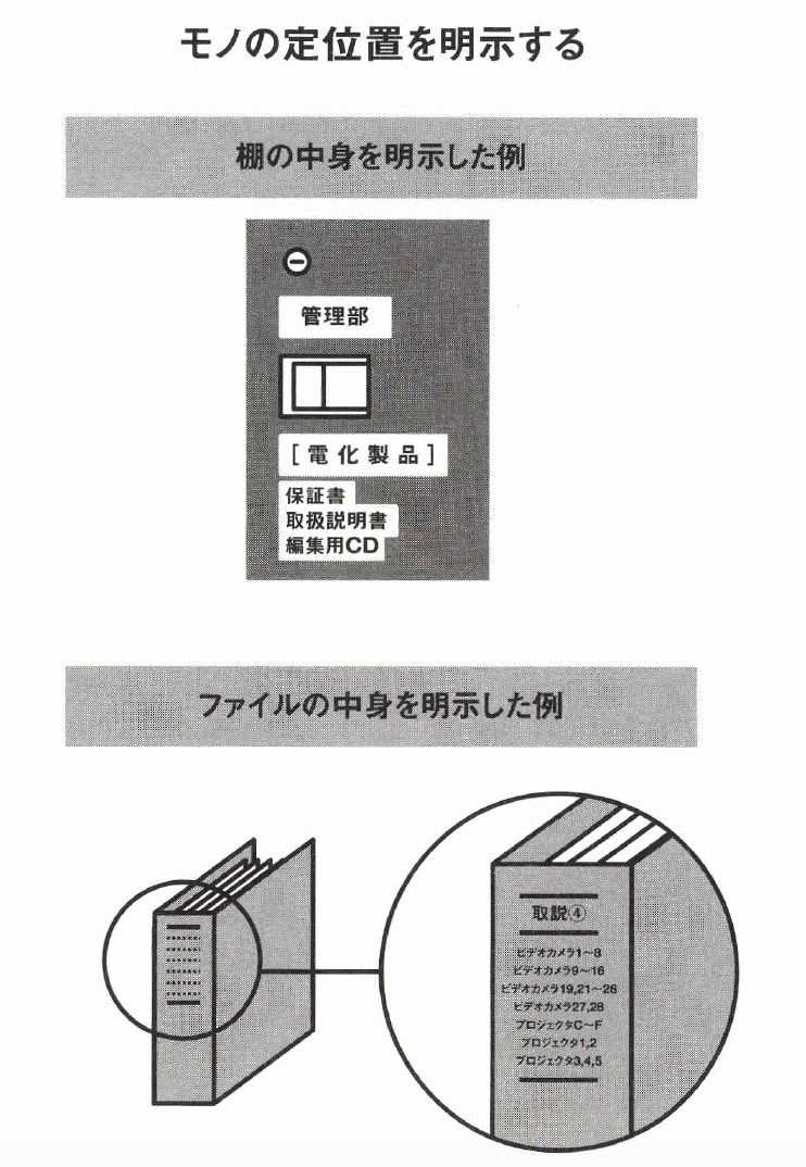 オフィスであれば、「販促関係の書類」「パソコン周辺機器」などと棚やキャビネットにはつきりと明示されていれば、戻す場所に迷うことはありません。