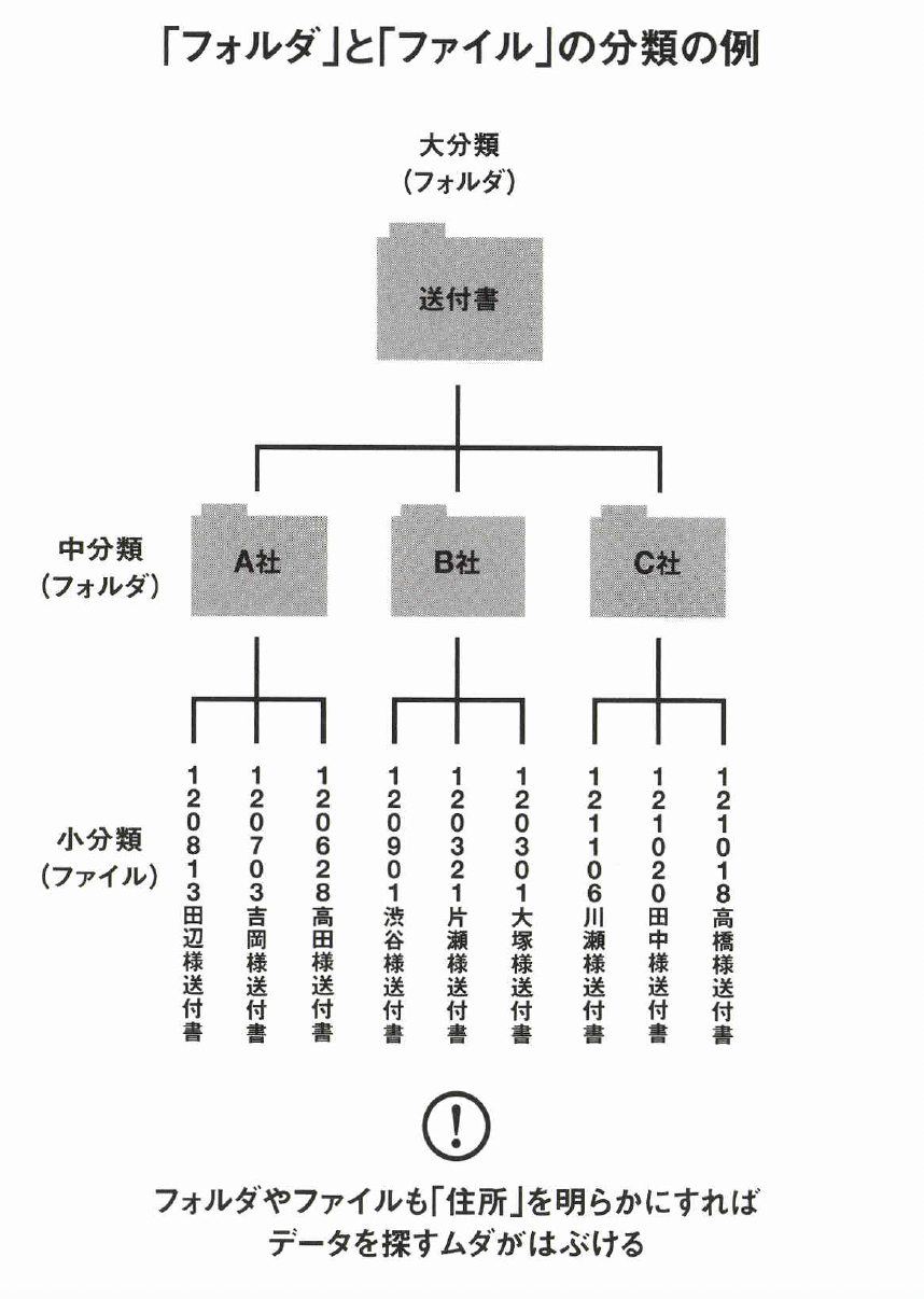 入口となる大分類のフォルダは、デスクトツプに置いておいてもよいですが、あまりたくさんあると入口でつまずいてしまうので、「デスクトップ上には、3列を超えるフォルダを置かないようにする」といった基準をもうけるといいで・しよヽつcフォルダは大まかなフォルダ名(所番地)でも問題ありませんが、それぞれのファイルは、日付、会社名やお客さまの名前、ファイルの内容など、細かい情報を盛り込んだファイル名がいいでしょう。