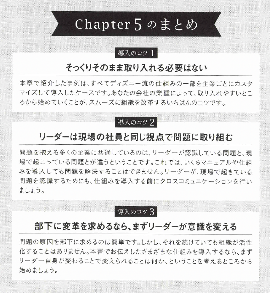 あなたの職場の課題や解決したい問題と照らし合わせながら読んでいただけ れば、デイズニー流の仕組みを導入する際のヒントになるはずです。