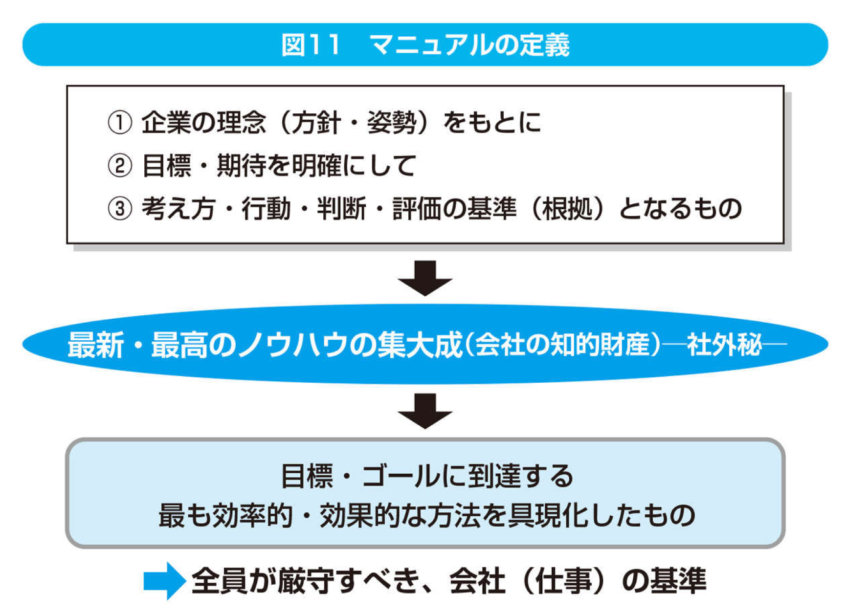 (1)マニュアルは、会社(仕事)の基準 ──会社の土台づくり── マニュアルは、会社の全員が厳守すべき仕事の基準です。