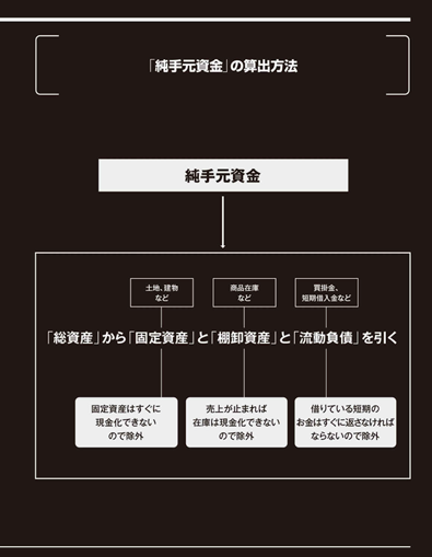 また、「純資産」にも土地、建物など、すぐに現金化できない固定資産が含まれるので、「純手元資金」とは言えない。商品在庫などの棚卸資産も売上が止まればすぐには現金化できない。